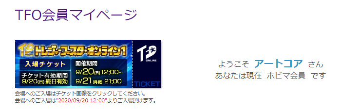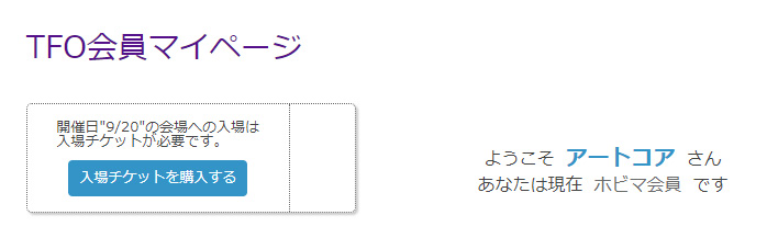 入場チケットをすでにお持ちの場合は、入場ケットが表示されます。この時、チケット画像をクリックすることで、TFO会場のページへ入場することができます。-