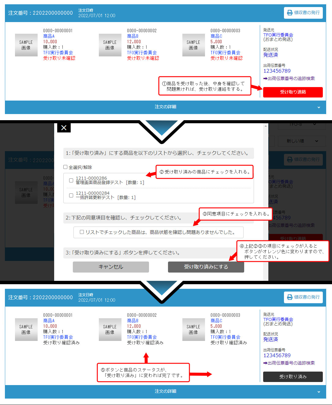 - 問題なく商品を受け取れた際には、早めに受取連絡の通知をお願い致します。