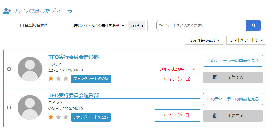 『ファン登録』したディーラーは、TFOマイページの「ファン登録したディーラーリスト」に保存され、いつでもそのディーラーの出品商品や情報を確認することが可能です。